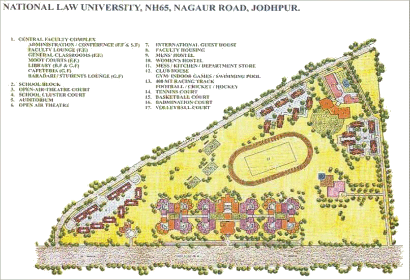 NLU Transitional Campus (Teaching Block, JNVU) : Situated in the southwest corner of the Jai Narain Vyas University, Jodhpur, the transitional campus of the National Law University is a modest beginning. National Law University's sprawling campus, presently under construction, is near Mandore that envisages the fulfillment of complete academic pursuit (see the inner cover).